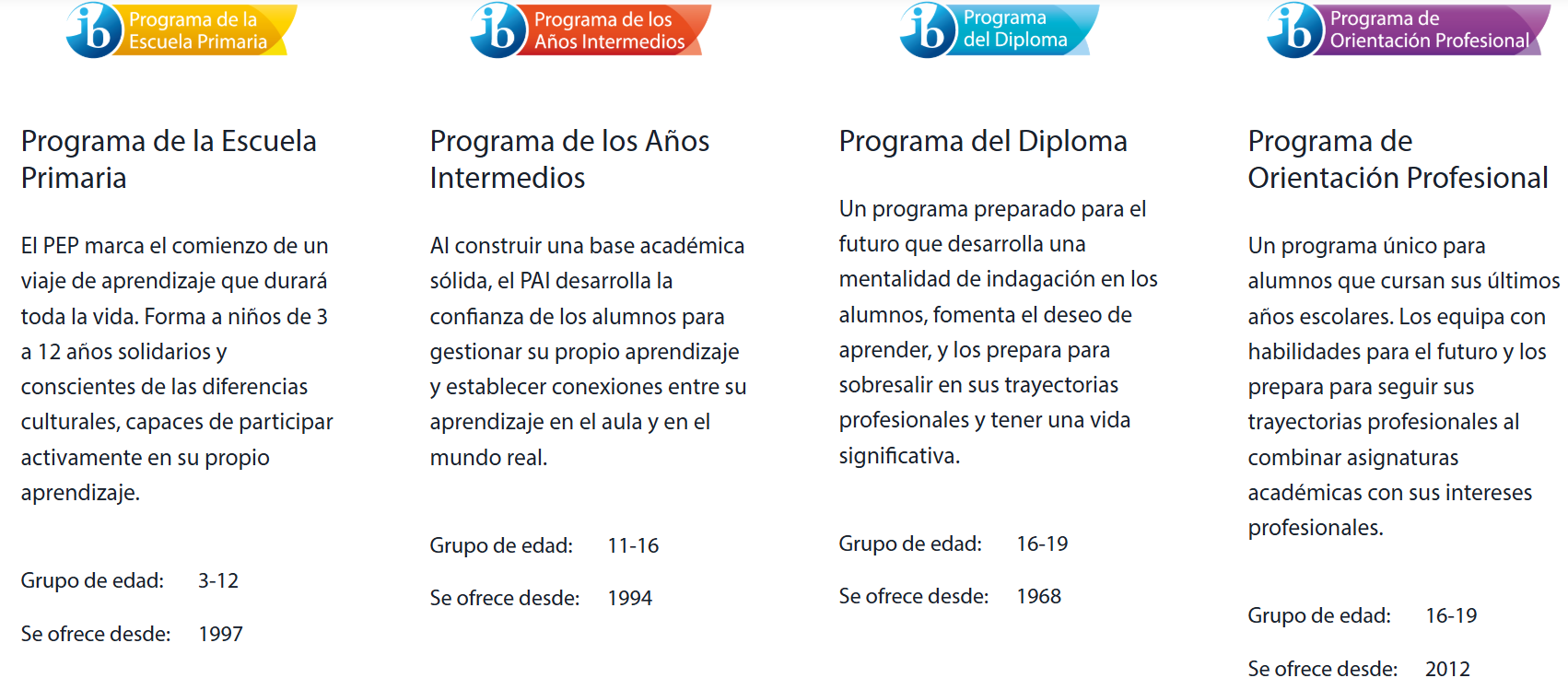 La Organización del Bachillerato Internacional (IB) “ofrece un continuo de cuatro programas de educación internacional exigentes y de alta calidad para alumnos de 3 a 19 años.”